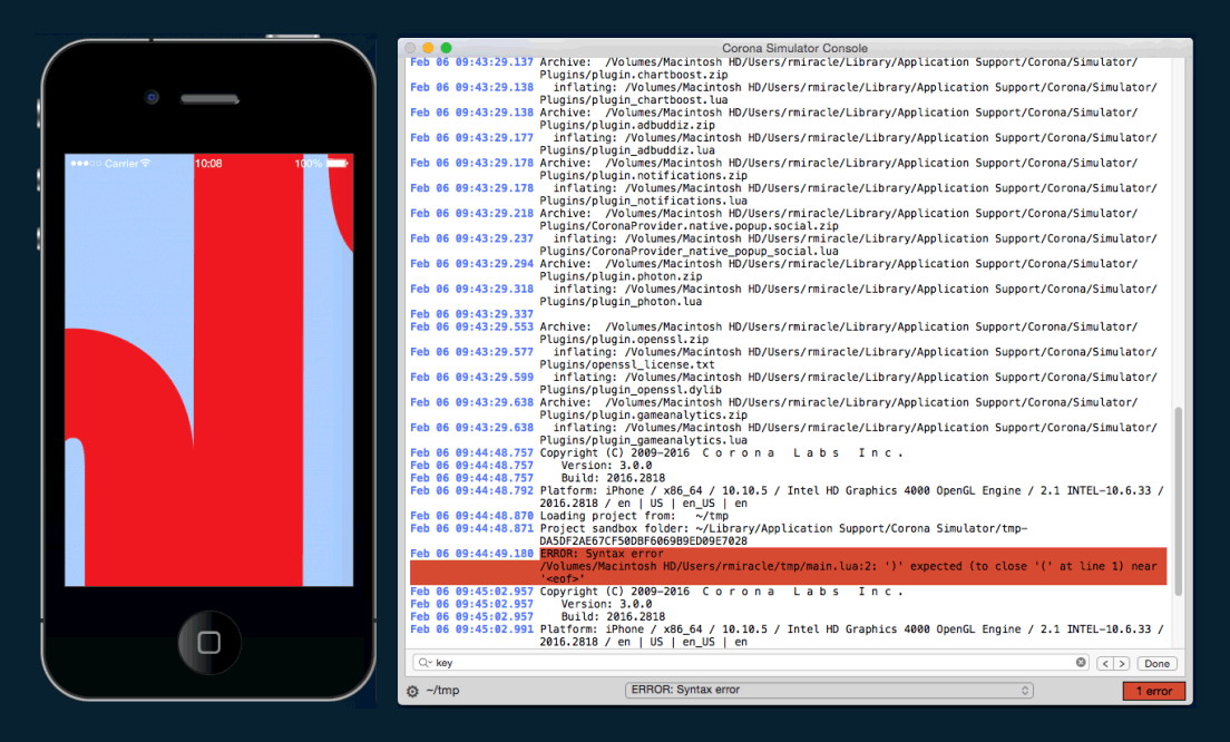 This release also improves upon the Corona Simulator’s interface, providing you with an even better experience. The big new feature in this regard is the Simulator console window. Previously, we used either the OS X “Terminal” app or the Windows “Command prompt” to output Corona console messages. Now, the built-in console window takes on this role and offer some exciting new features, including: