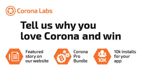 We will select five winners from the submissions. In addition to having your story featured on our website’s Stories page, each winner will receive a one year license to the Corona Pro Bundle. The best overall story will also receive 10,000 app installs if they have at least 2,000 total installs and have an app store rating of 3.5 or higher and the app is free. Installs are not available for paid apps.